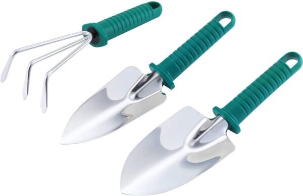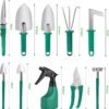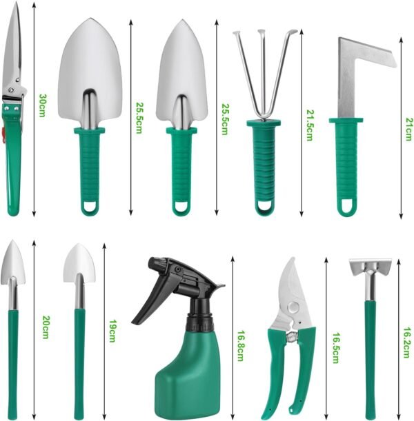 • Multifunctional garden tool set: 10 pieces, including shovel, trumpet shovel, rake, mini rake, garden shears, moss shovel, mini shovel, mini tip shovel, grass scissors, spray bottle (watering can). This garden tool set is very suitable for digging, weeding, loosening, ventilation, transplanting, pruning and watering. You can use it safely and easily for gardening indoors and outdoors.