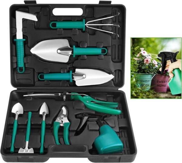 • Note: Lightly unscrew the nozzle to spray water out when using the spray bottle. This garden tool set is a perfect gift for garden lovers. The tools are exquisite and high quality, the tool box has a stylish appearance and the internal storage settings are appropriate. It is loved by all gender and age